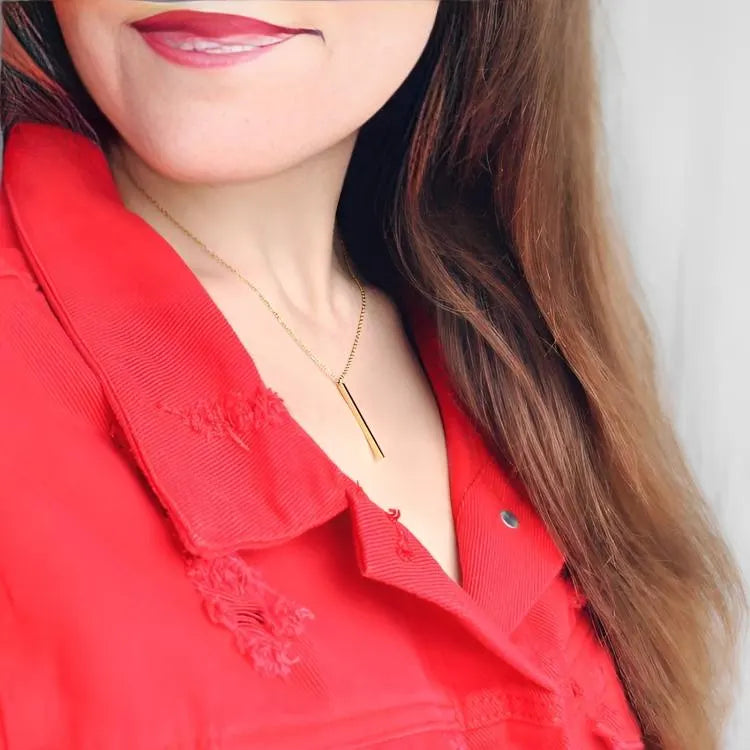 A clean, minimal vertical bar pendant that goes with everything. Crafted from durable 316L stainless steel and plated with 14K gold for a warm, polished finish. The slim rectangular pendant sits neatly at the collarbone and layers easily with chokers or longer chains.